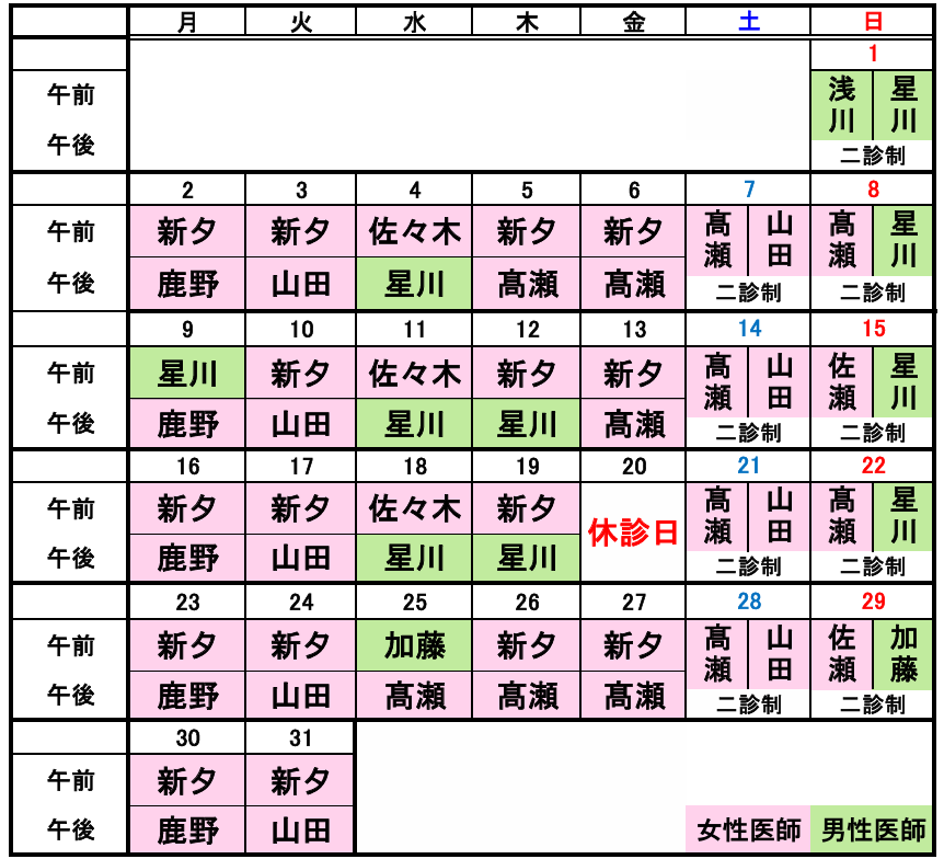 ・緑色は男性医師、ピンク色は女性医師です
