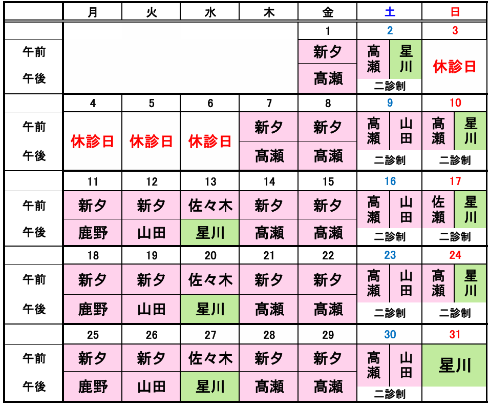 ・土曜日・日曜日は2診制の為、先生の希望がある方は受付時にお申し付けください