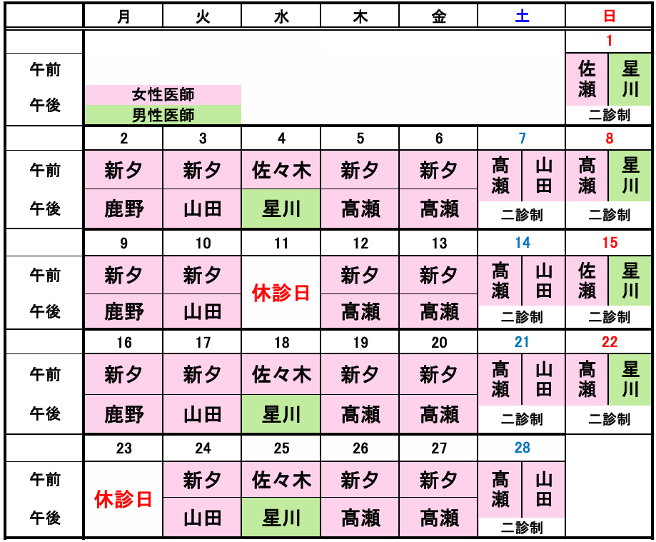 ・土曜日・日曜日は2診制の為、先生の希望がある方は受付時にお申し付けください