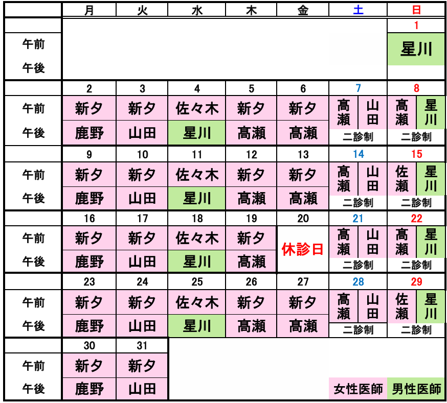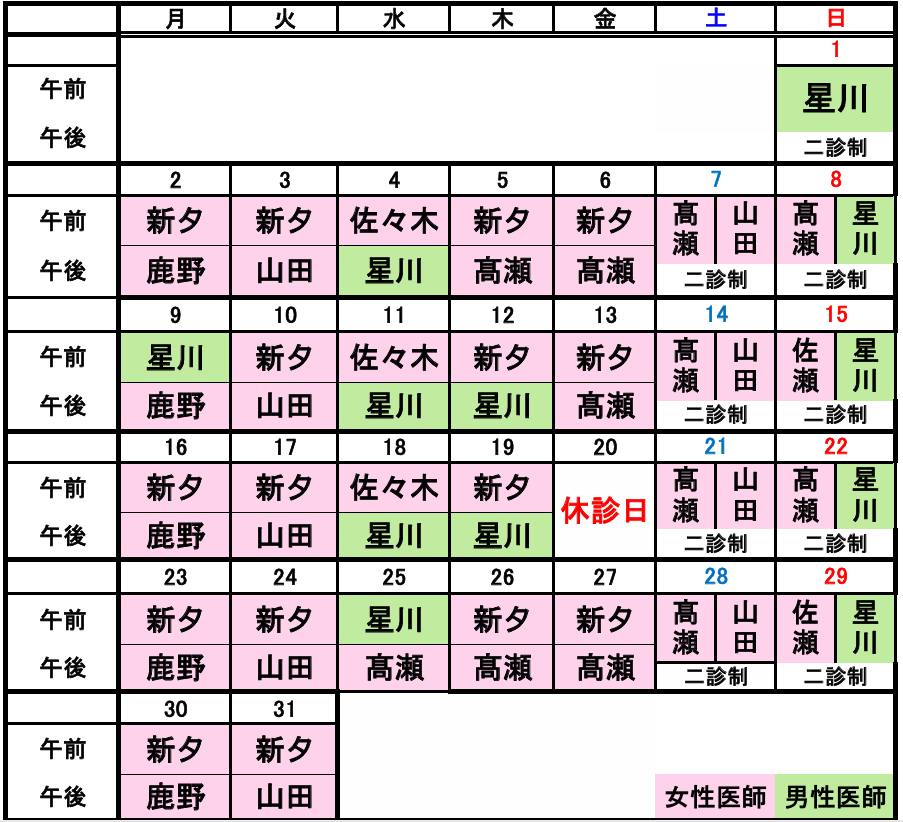 ・緑色は男性医師、ピンク色は女性医師です
