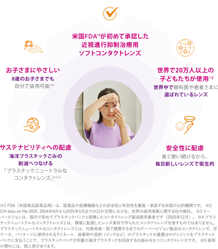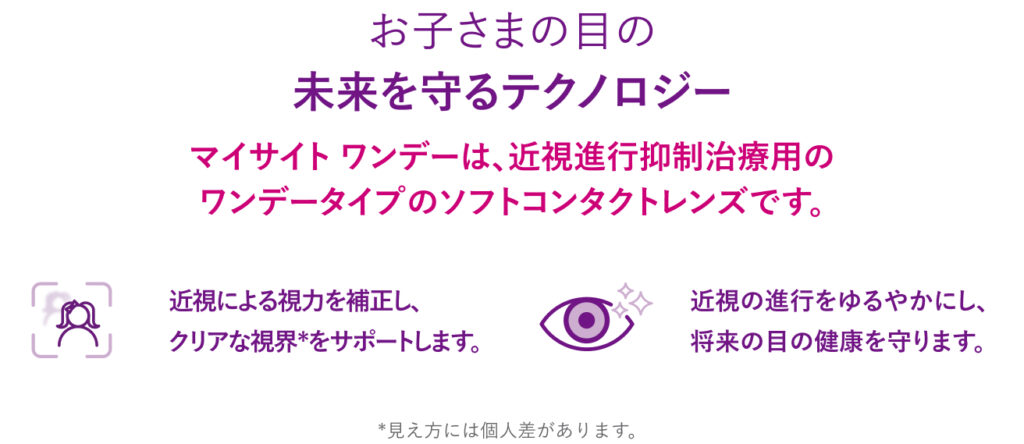 当院では2026年3月よりマイサイトワンデーを取り扱っております。国内初承認の近視進行を抑制する効果が科学的に示されている小児向けの1日使い捨てソフトコンタクトレンズです。